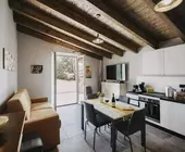 Aansluitend aan het huis, en bereikbaar vanuit beide keukens, bevindt zich een gezellig terras met zonnewering en tafel en stoelen voor 8 personen.